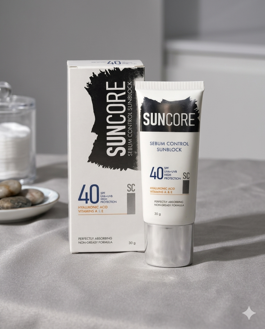 Suncore Sebum Control sunblock regulates sebum production, reduces acne and oily skin, while unclogging pores and preventing future breakouts. It provides long‑lasting protection against UVA & UVB rays, preventing premature aging and skin damage. The product also offers advanced protection, soothes & calms the skin, reduces inflammation, and provides long‑lasting hydration, leaving skin clearer, healthier, and more radiant
